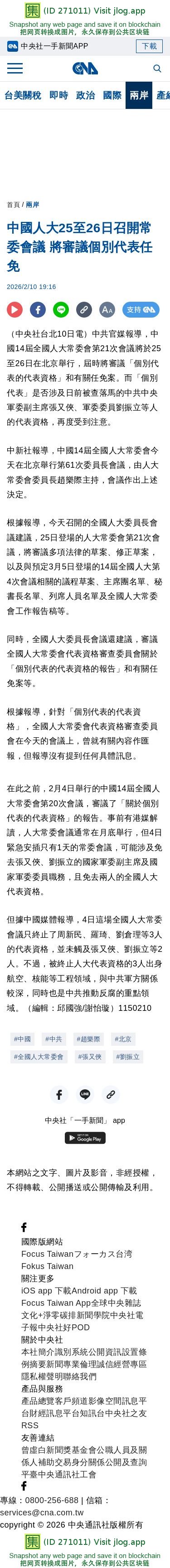中國人大25至26日召開常委會議 將審議個別代表任免 | 兩岸 | 中央社 CNA
