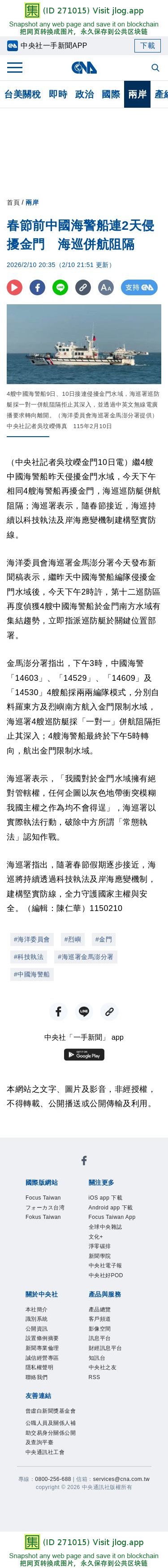 春節前中國海警船連2天侵擾金門 海巡併航阻隔 | 兩岸 | 中央社 CNA