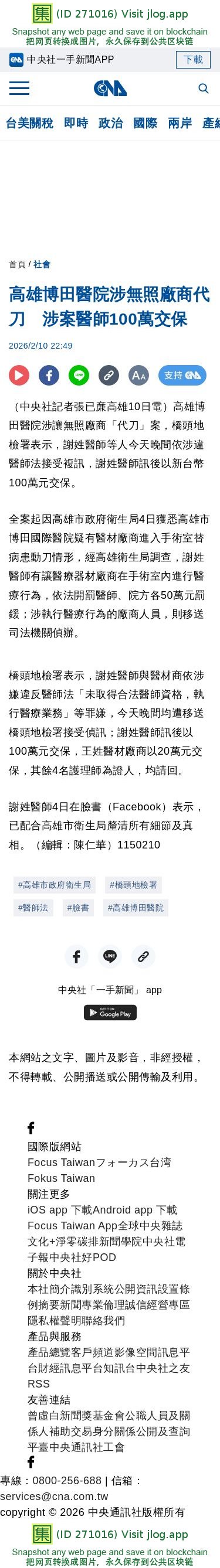 高雄博田醫院涉無照廠商代刀 涉案醫師100萬交保 | 社會 | 中央社 CNA