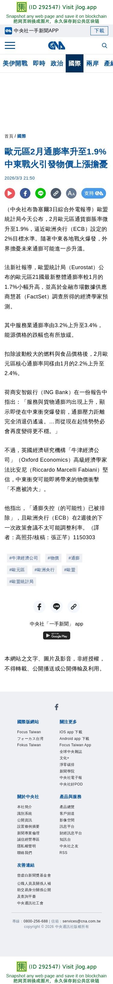 歐元區2月通膨率升至1.9% 中東戰火引發物價上漲擔憂 | 國際 | 中央社 CNA