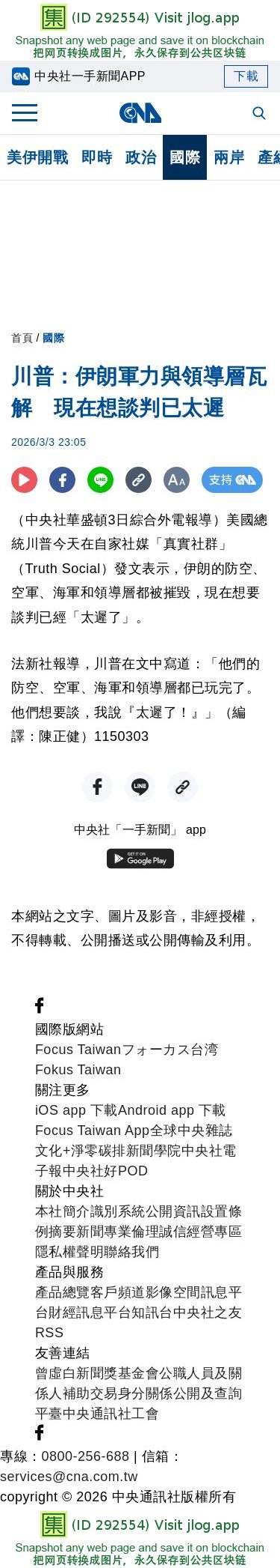 川普:伊朗軍力與領導層瓦解 現在想談判已太遲 | 國際 | 中央社 CNA