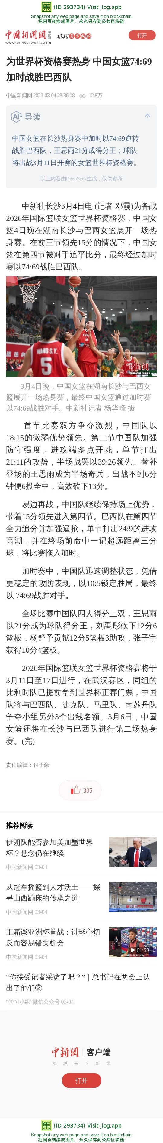 为世界杯资格赛热身 中国女篮74:69加时战胜巴西队