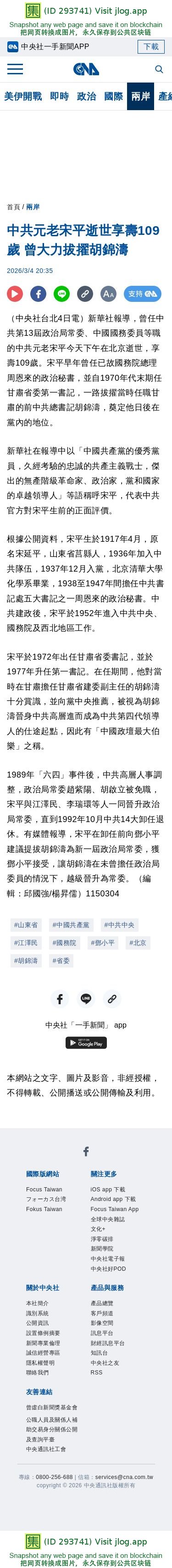 中共元老宋平逝世享壽109歲 曾大力拔擢胡錦濤 | 兩岸 | 中央社 CNA