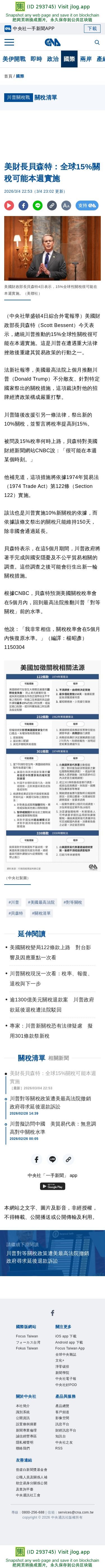 美財長貝森特:全球15%關稅可能本週實施 | 國際 | 中央社 CNA