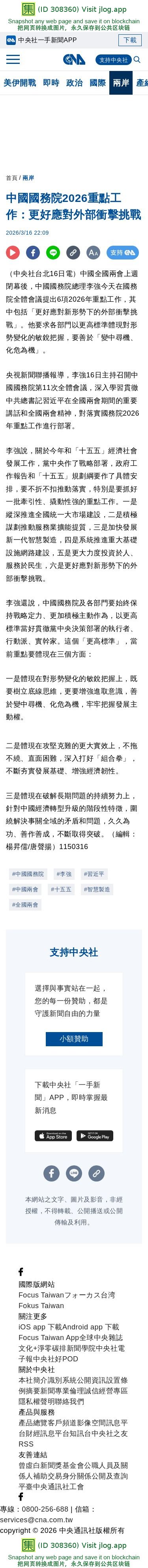 中國國務院2026重點工作:更好應對外部衝擊挑戰 | 兩岸 | 中央社 CNA