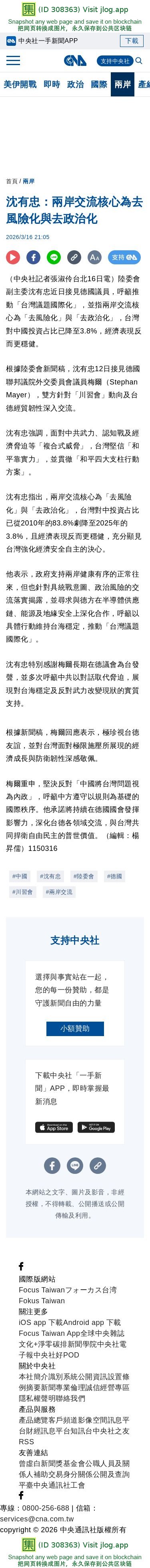 沈有忠:兩岸交流核心為去風險化與去政治化 | 兩岸 | 中央社 CNA