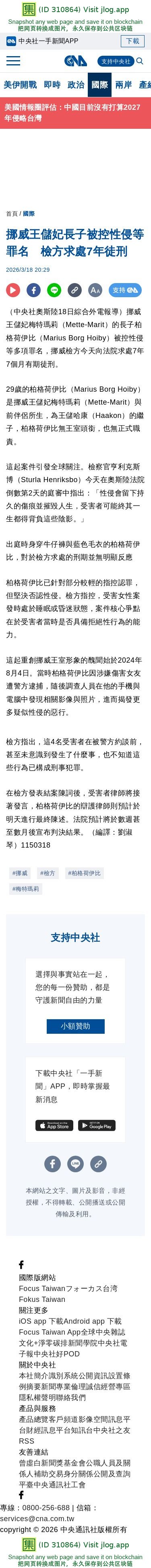 | 挪威王儲妃長子被控性侵等罪名 檢方求處7年徒刑 | 國際 | 中央社 CNA | 集诚信 | 3 | 1 | 03-19 09:47 |