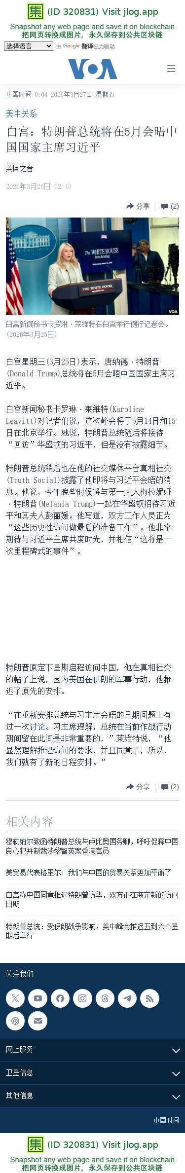 白宫:特朗普总统将在5月会晤中国国家主席习近平