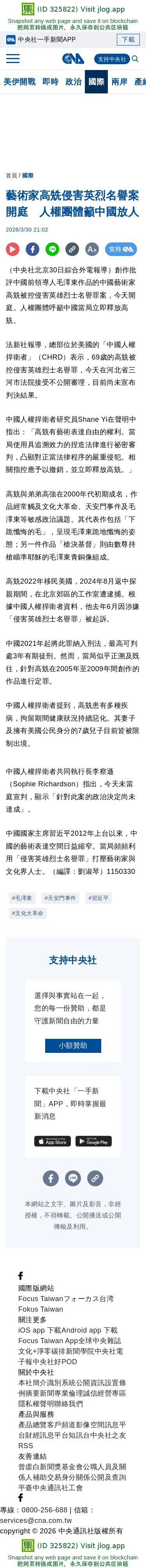 藝術家高兟侵害英烈名譽案開庭 人權團體籲中國放人 | 國際 | 中央社 CNA