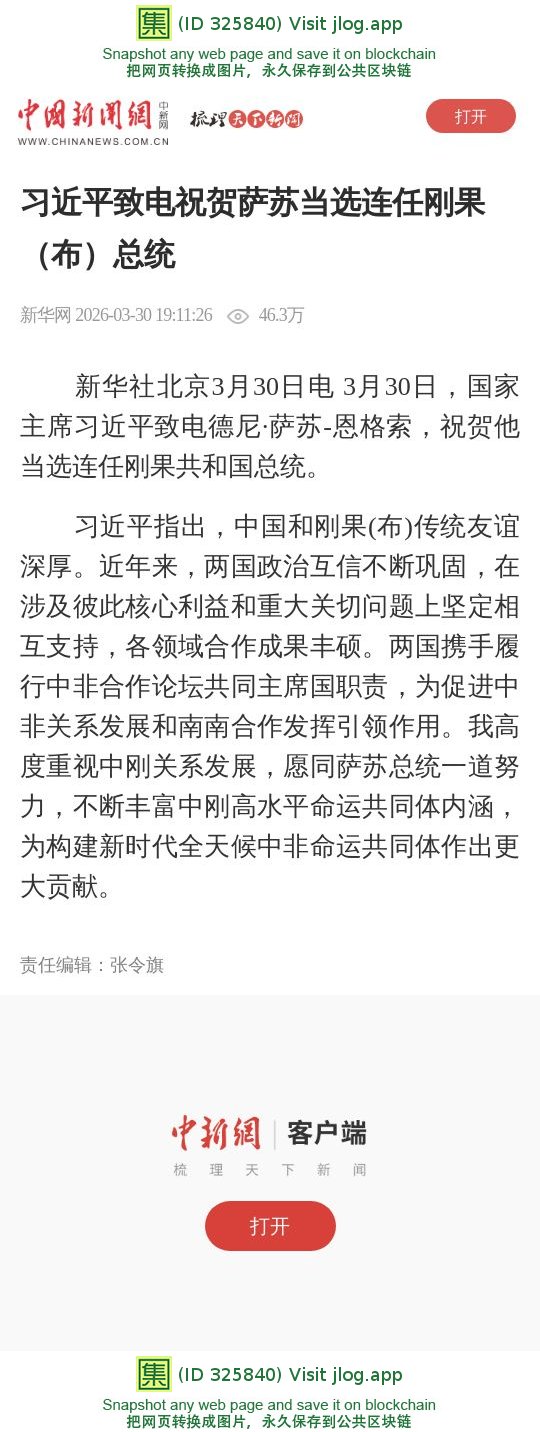 习近平致电祝贺萨苏当选连任刚果(布)总统