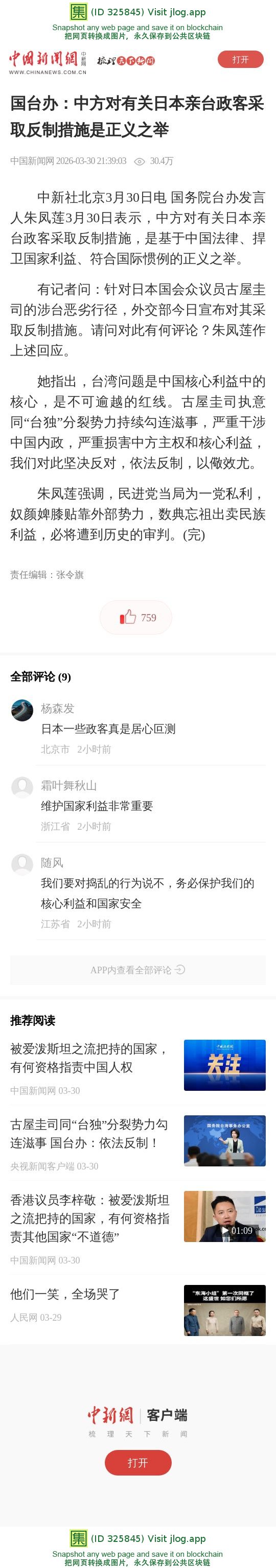 国台办:中方对有关日本亲台政客采取反制措施是正义之举