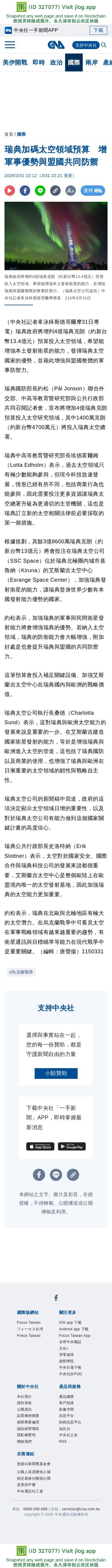 瑞典加碼太空領域預算 增軍事優勢與盟國共同防禦 | 國際 | 中央社 CNA