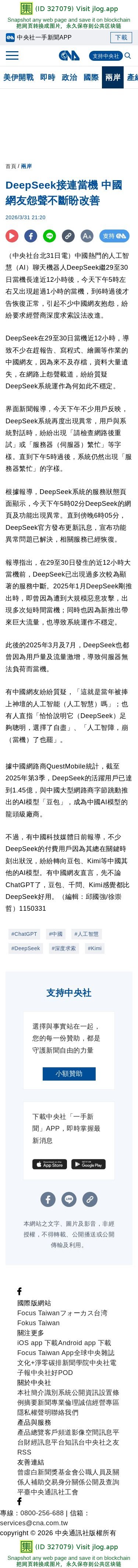 DeepSeek接連當機 中國網友怨聲不斷盼改善 | 兩岸 | 中央社 CNA
