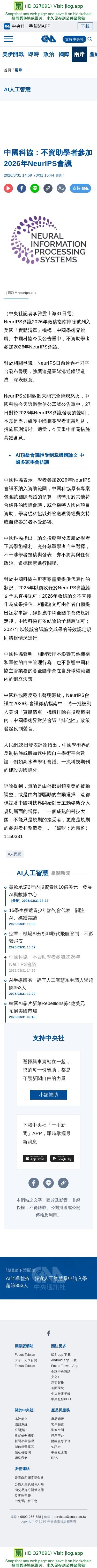 中國科協:不資助學者參加2026年NeurIPS會議 | 兩岸 | 中央社 CNA