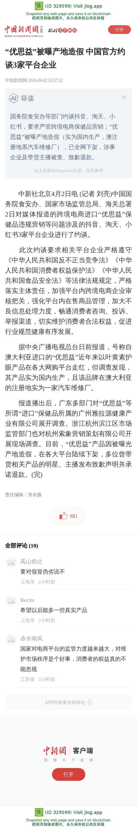 “优思益”被曝产地造假 中国官方约谈3家平台企业
