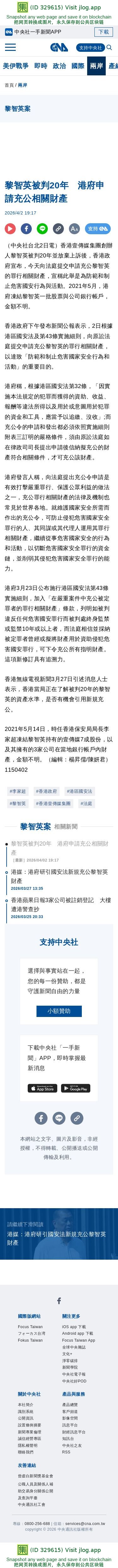 黎智英被判20年 港府申請充公相關財產 | 兩岸 | 中央社 CNA