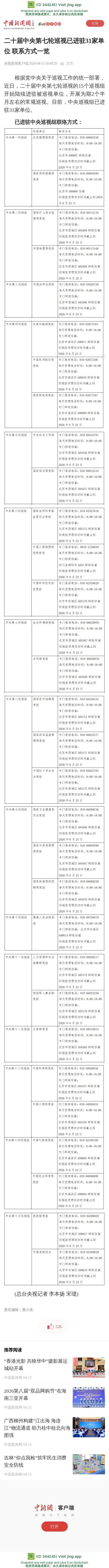 二十届中央第七轮巡视已进驻31家单位 联系方式一览
