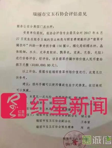 除国门派出所,当地市场监督管理、姐告工管委、旅游部门等多部门纷纷参与了此纠纷的调解,但未成功。 地摊货是否值30万天价、游客是否是报了低价团进了强制购物店?此事经社交媒体传播后迅速发酵,姐告玉城乃至整个云南的旅游、玉石两大市场饱受质疑。 6月28日,瑞丽官方就此事发布调查结果称,此事为意外事件,现场并没有发生强买强卖、欺诈、胁迫、诱导等违法相关法律、法规的行为。 调解期间,林氏翡翠提供了由云南省珠宝玉石质量监督检验研究所出具的《天然翡翠饰品合格证书》,证明其是A货。 瑞丽市宝玉石协会评估专业委员会的专家也到调解现场对手镯进行价值评估。由该协会常务副会长储云春、副会长王春雷、常务理事周彪三人所作的评估意见称,受损手镯水头、光泽度较好,飘翠色、完美、无裂无脏,经评估,该翡翠手镯市场价值人民币壹拾捌万元整。 意见称,该评估依据当前瑞丽翡翠市场价进行,仅供参考。三名评估人还建议,损坏手镯可使用镶嵌包金方式修复,依旧美观可佩戴。 ![]() ▲瑞丽市宝玉石协会评估意见 不过,瑞丽市宝玉石协会三人小组的评估非但没能化解纠纷,反而让此事招来更多质疑。其中最大的质疑声是:喊价30万的手镯,为何鉴定只值18万,为什么一下子“缩水”12万?宝玉石协会的鉴定,可信度、权威度又有多少? 参与此次评估工作的储云春解释,这是一条原条手镯,相比扁条镯更费料,该手镯质地较细腻,飘的是绿花,相比飘蓝花价格更高。他说,翡翠的种水、质地、颜色非常复杂,在国际上也没有一个标准的价格评估体系。 玉石商人白洁(化名)介绍,灵动感强、颜色嫩、晶体细腻、杂质少、水头老等因素,是行业评估一块好翡翠的依据,但这需要具备多年经验者才能作出判断。 女游客玩消失? 姐告玉城隔空喊话求正名 李月超说,意外摔碎手镯的情况,在姐告玉城时有出现,但双方多能各有让步妥善解决。然而这一次,因事件中的“昏厥”因素,却招来了外界对当地整个玉石市场的批判。 李月超认为,不是没有办法解决当前各方的困惑,“只要她真的能证明自己无力赔偿,公司和市场的一些爱心商家都愿意资助。” 玉城工作人员称,费建勤当时含糊其辞,“她诉苦称自己江西老家有两三套房子,但因为丈夫治病的原因变卖了,可她一会说丈夫病重,一会又说丈夫死了;一会说儿子还没大学毕业,一会又说儿子已经工作了。” “但现在的问题是,她昨天(6月29日)开始就电话失联,和我们玩消失。”6月30日,李月超在其办公室告诉红星新闻,外界误解越来越深,他们不得不隔空喊话,希望费建勤女士为玉城正名。 摘自红星新闻