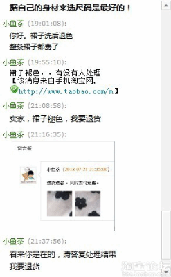 7月22日 卖家继续以衣服下水影响二次销售为理由拒绝协商。 再也不相信淘宝维权的实质意义了。说再多也是废话。 总结: 1、下单前一定要在旺旺跟卖家沟通关于衣服褪色赔不赔的问题。 2、不要急于给卖家好评,卖家翻脸比翻墙还快! 3、不要相信淘宝里还有人性! 4、卖家你们就大胆的卖会褪色的商品吧,反正衣服下水了才知道会不会褪色。等买家发现,为时已晚。 5、卖家的二次销售比买家的能不能再穿还重要。淘宝就是这么给弱势。 打赏 | |