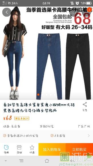 买的黑色的小裤脚牛仔裤。收到货后很不满意,一大股味道不说,裤子边还有许多的线头,然后我用打火机先把线头弄掉后又急忙把裤子...